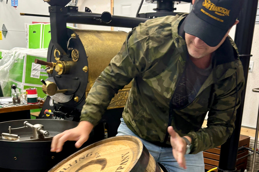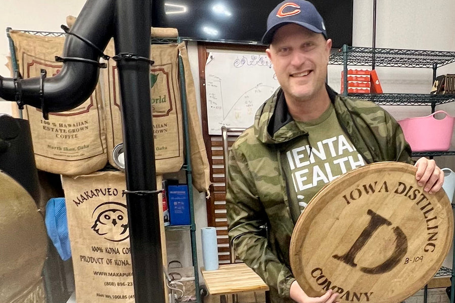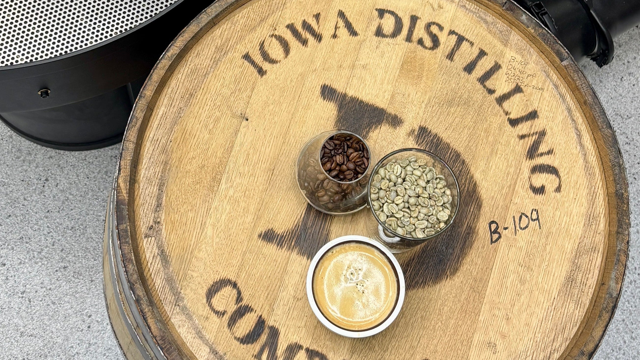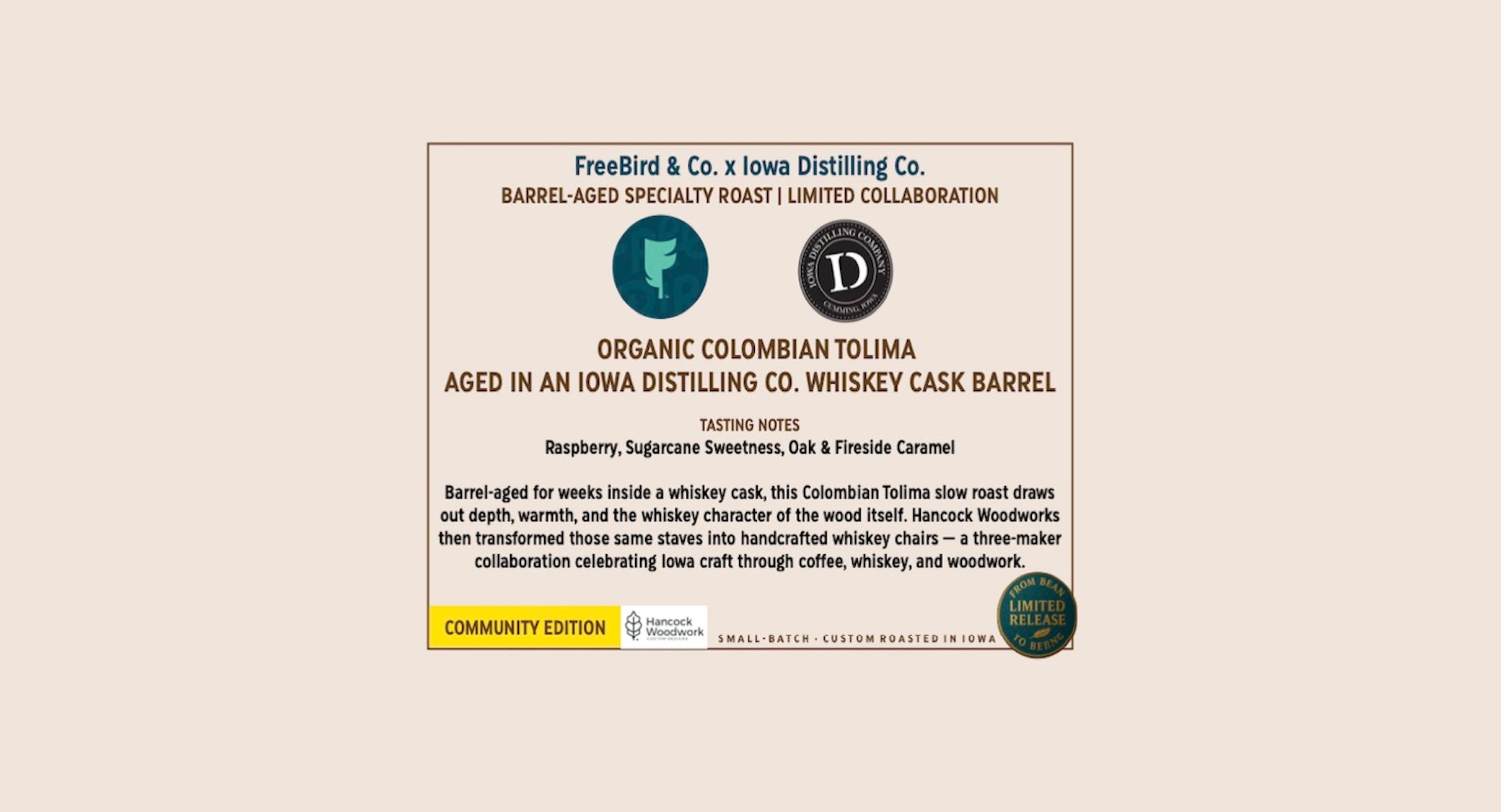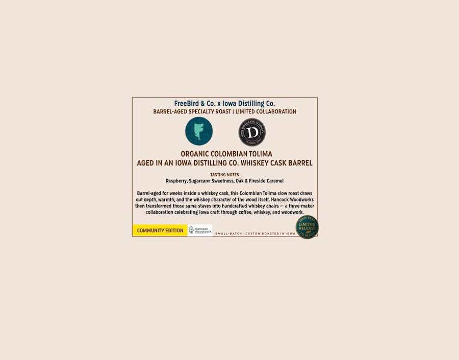Organic Colombian Tolima, aged in an Iowa Distilling Co. whiskey cask barrel - a three-maker craft between FreeBird, Iowa Distilling, and Hancock Woodworks.